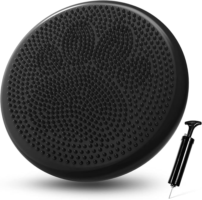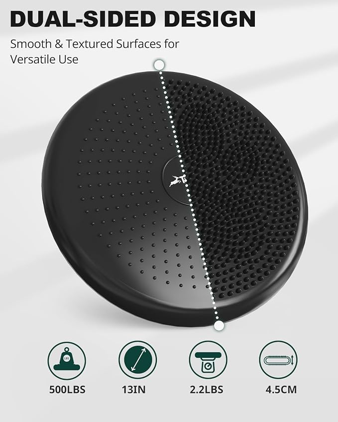 - 【Adjustable Firmness with Pump】34cm/13.4in diameter, 500lb capacity. Includes an inflation pump to customize firmness—softer for support or firmer for challenging exercises.