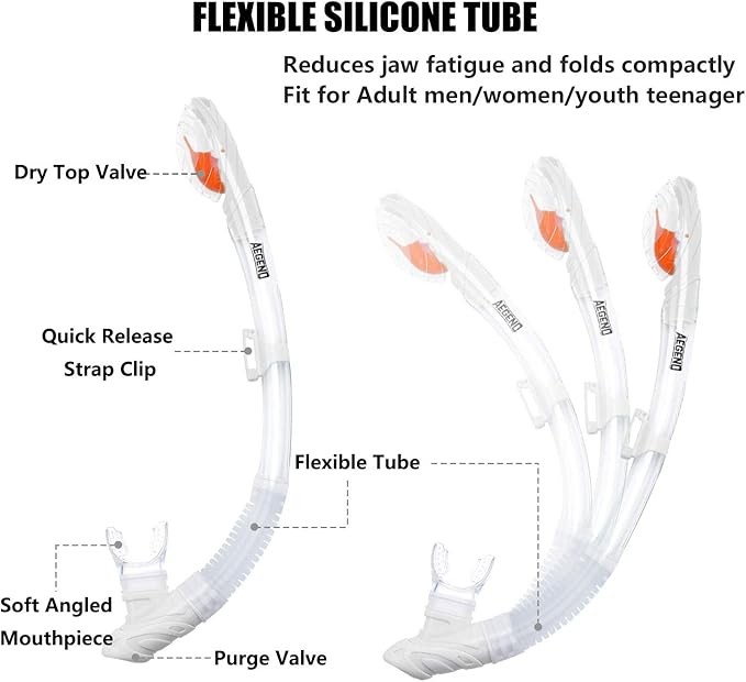 - Advanced Dry Valve and Splash Guard: The innovative dry top valve automatically seals when submerged, effectively blocking water entry. The splash guard further protects against waves, while the advanced design prevents clogging from sand or debris, ensuring consistent and comfortable breathing.