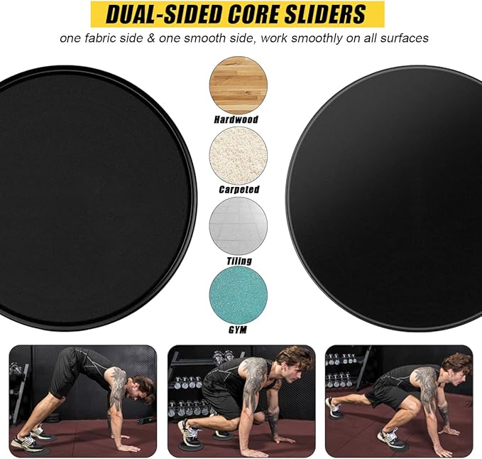 - Double Sided Sliders: 2 fitness core sliders work smoothly on all surfaces so that you wonโt matter what surface youโve got. Double Sided, one is fabric side and the other is smooth side, it ensures you slide easily and keep your feet stay in place. The discs are total body workout that is very low impact but highly effective for building core strength, gives you an intense abdominal and entire body workout.
