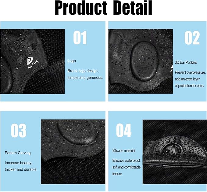 - Premium & Thicker Silicone Material: Alepo swim cap is made from high-quality eco-friendly silicone material, which features durable, tear-resistant and anti-aging. Great elasticity makes it stretch easily, no deformation after repeated use. The silicone material is also odorless, non-toxic, skin-friendly, so our premium swim cap is safe to use!