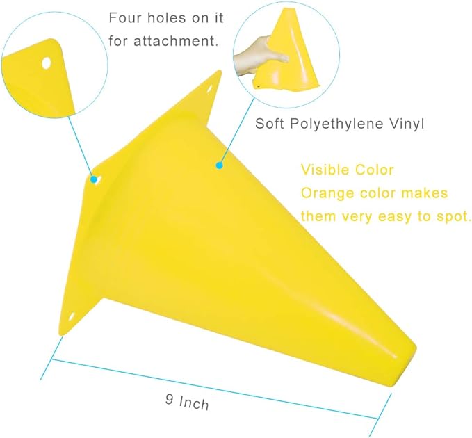 • Size - measures 9 inches in height, 5.5 inches in diameter. Four holes on marker cones for attachment, if it is a windy day, you do not need to worry it will blow all over the place.
