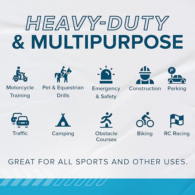 - Hassle-Free Agility Training: With a 8.2" square base and 1.0" thick base height, they work great as sports cones for drills, motorcycle training cones, and more. Our outdoor cones are more stable and less likely to be knocked over during dribbling drills. Now, coaches don't have to constantly fix their field markers for a more productive and hassle-free practice in all weather conditions.