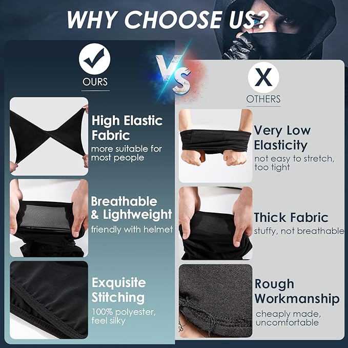 - ?�Versatility?‘Can be worn as opened or closed balaclavas, face masks, neck gaiters, scarf or bandanas, helmet liners & ninja hoodie, or headbands even wristbands. People use Achiou full face mask for skiing, riding, fishing, snowboarding, motorcycling, hiking, climbing, running or cosplay. Just don't wear it in an airport or bank