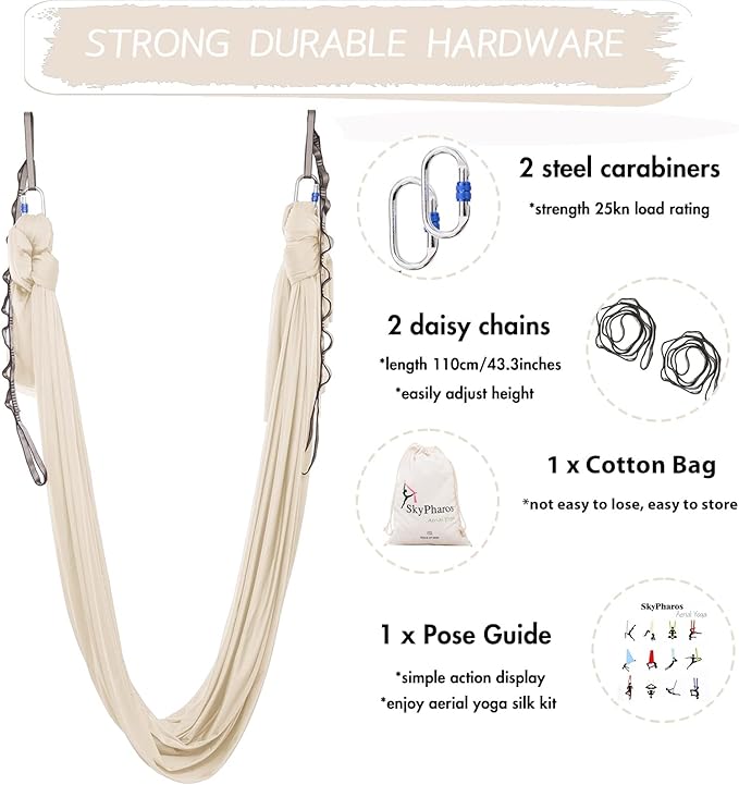 - HEAVY-DUTY HARDWARE - The flying yoga hammock includes ALL THE HEAVY-DUTY hardware required to safely install it yourself. You will get 5.5 yards aerial silk, 2 x daisy chains,2 x Steel Carabiners, 1 x Pose Guide, 1 x carry bag. They are strength and safety certified with high weight-load capacities.