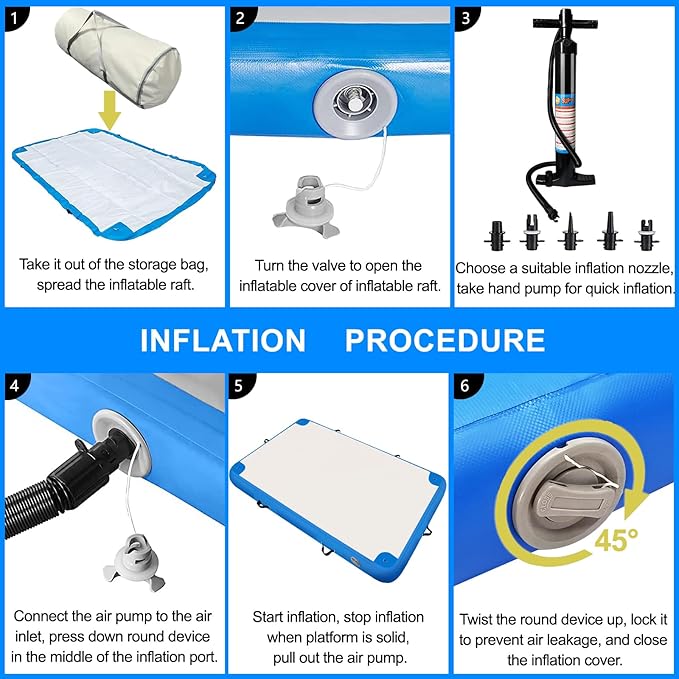 - 【COMPLETE SET】 Comes with inflatable dock swim platform, a hand pump, white carry bag, 1 patch kit (including Inflation port wrench), 4 stainless steel heavy duty anchor D-Rings tie downs, 4 soft neoprene reinforced handles, and 1 high pressure inflate/deflate HR valve.