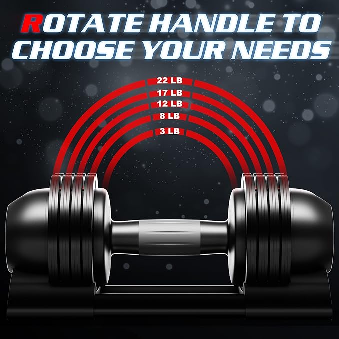 - Adjustable Weight - Come with 2pcs dumbbell set. Each adjustable weight dumbbell features free weight adjustment from 3- 8-12-17-22lb, the total weight of dumbbell set is 44lb. Suitable for beginners to professional. Committed to meet your needs for diversified weight training, it is a great choice for modify muscle lines and strong muscle fibers