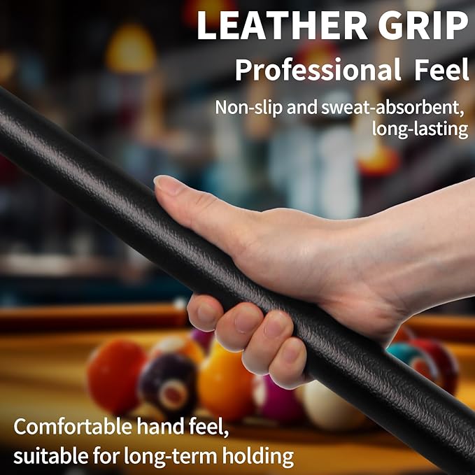 - Comfortable Pool Stick: The grip is leather-wrapped, cracked texture, sweat-absorbing and non-slip, comfortable to hold for a long time without tiring hands, reducing deflection and improving accuracy