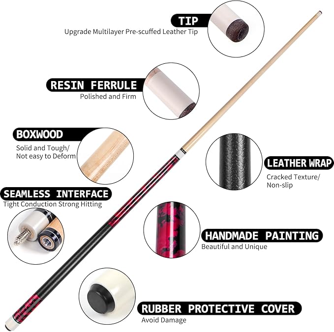 - Cool Pool Sticks for Adults: Unique hand-painted and multi-layer varnish effectively prevents wood from moisture and deformation, making it convenient for players to maintain the cue