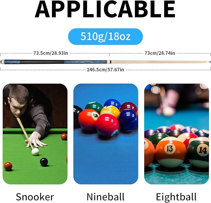 - Straight Pool Cue: Selected Canadian maple solid wood, each cue is hand-polished to ensure that the cue is straight and smooth, the stainless steel joint is sturdy and durable, and the rubber tail plug effectively protects the bottom of the cue. You will be surprised when you hit the billiard ball with this cue