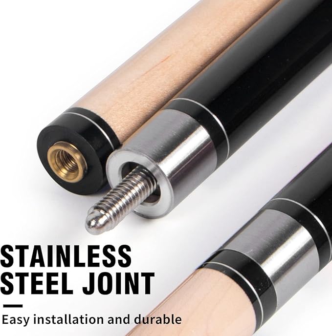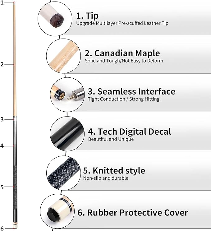 • Canadian Maple Wood:Firm and durable, we have chosen the best quality for the pool stick and the pool cue tips durability. Each pool cue case contains 4 unique pool cues sticks