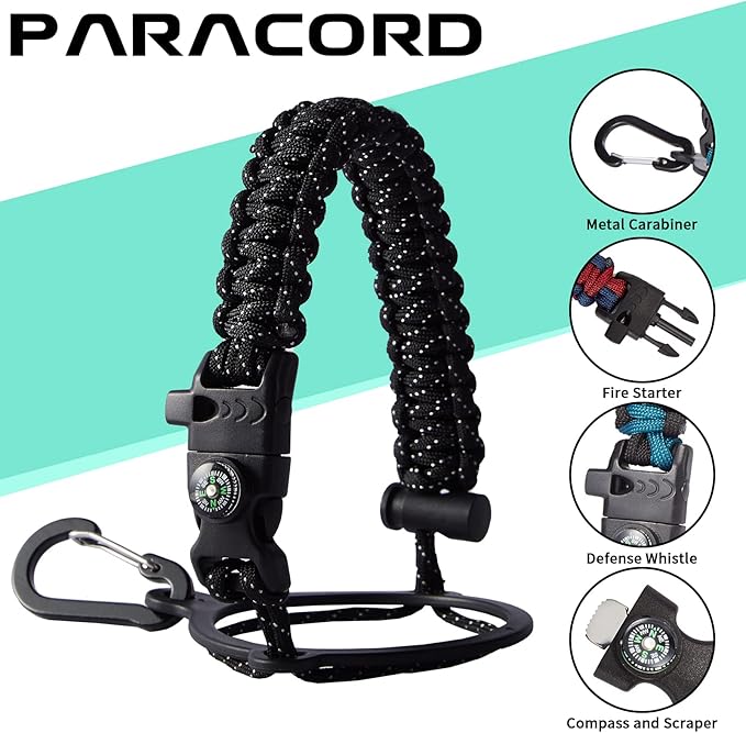 - UNIQUE PARACORD HANDLE: Bright color paracord matches the flask water bottle to give you a youthful vibe while adding a personal style. With a compass, safety loop, metal carabiner, flint, igniter and whistle to become your survival tool, making the 32 oz stainless steel water bottle with paracord an ideal survival kit for expeditions in the wild