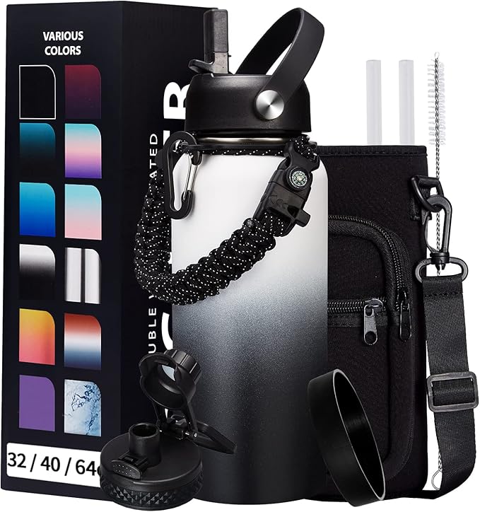 - SUPER JOYFUL COMBO: Buy 32oz insulated water bottles and get 9 accessories (2 x lids, 1 x survival paracord, 1 x carrying pouch, 1 x shoulder strap, 1 x protective cup mat, 2 x straws, 1 x straw brush). WITH A LIFETIME GUARANTEE, these thermal water bottles are perfect gifts for using at home, work, school, road trips, hiking, sporting events, or just hanging out