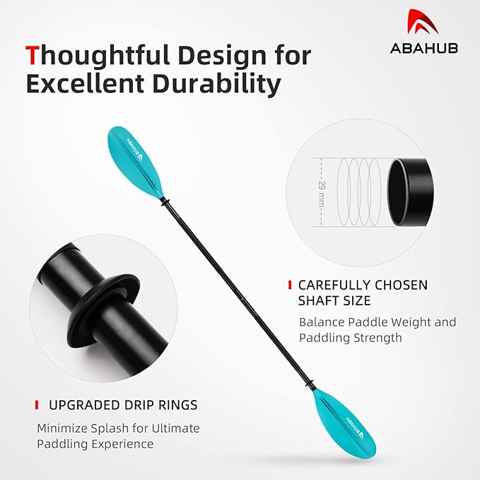 - MADE to LAST: Made of premium quality 1.15mm thick, 29mm diameter aluminum alloy shaft, and fiberglass reinforced polypropylene blades, total weighs 37oz (1050g). This kayak paddle is impact and erosion resistent, thus for great durability. It’s perfect for beginner and intermediate kayakers.