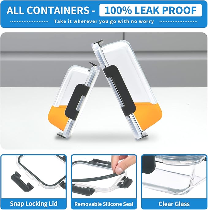 - 【100% Leak Proof Airtight Lid】Glass food containers is designed with removable silicone seals and 4-hinge snap locks to ensure zero leaking or spilling, which also prevent smell go out and keep food fresh.