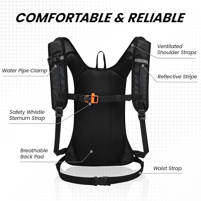- Comfortable & Adjustable: Rave hydration pack constructed with an ergonomic breathable and soft padded back panel to make you more relaxed, adjustable shoulder straps with adjustable sternum and waist straps providing ultimate comfort by taking the weight off your back, made for comfort, and perfectly adjustable for all sizes