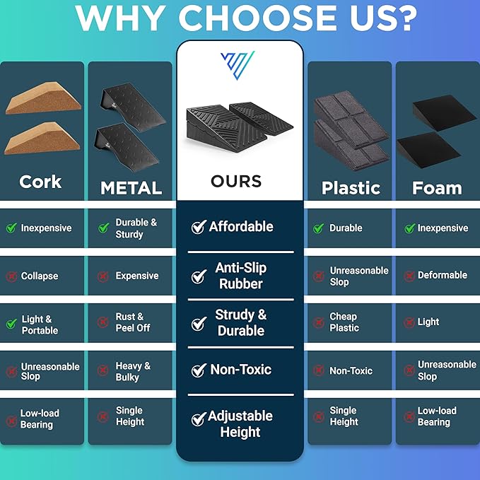 - 💪 4PCS adjustable slant board system includes four rubber wedges to create 3 incline levels (9°, 13°, 22°) for strength, flexibility, and squat depth. Works as a heel elevated squat wedge, squat wedge board, or calf raise block to improve dorsiflexion and lower-body mechanics.