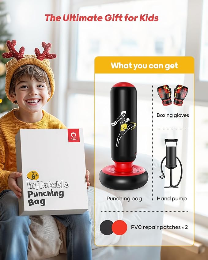 - IDEAL SIZE: The kids punching bag is 66 inches tall after fully inflated. Itโs designed for kids 6+ years old and encourages more enjoyable family time. Its bottom base is 31 inches long in diameter, wider than most punching bags on the market, and that provides more stability with weight. The inflatable punching bag helps children strengthen physical fitness and relieve energy while they are at home.