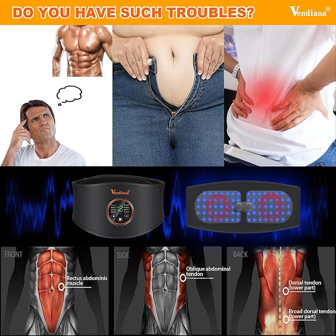 - 【Upgraded Multi-Mode/Arbitrary Size Adjustment】:Vendiana abs stimulator abdominal 8 modes * 15 intensity, You can adjust the mode and intensity you enjoy, With USB interface, Long service life, Additional extension strap can adjust the size to about 57 inches, One size Suitable for anyone.