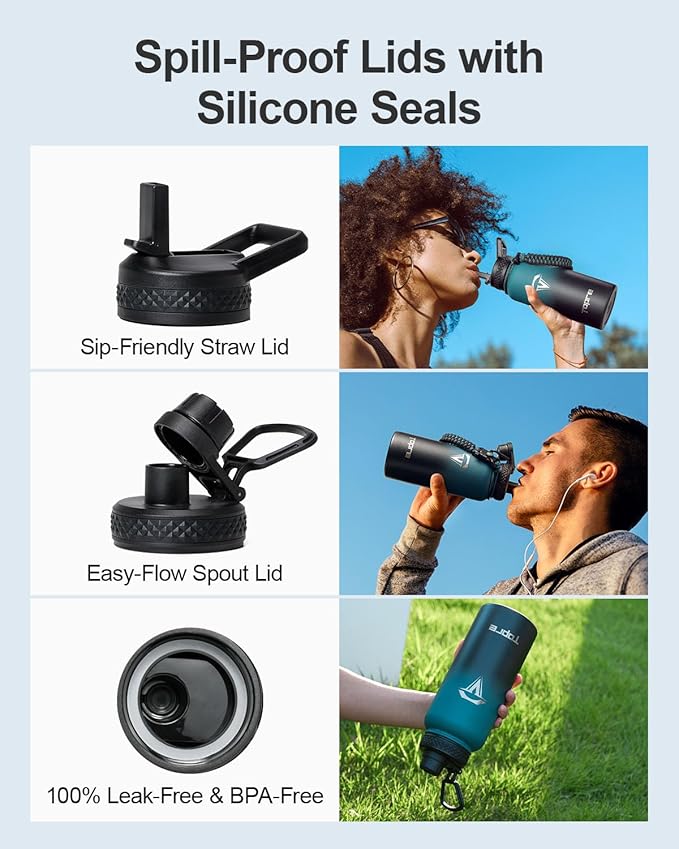 - 100% Leak-Proof: Topre 32oz stainless steel water bottles includes two lids—a straw lid and a spout lid. Both are equipped with silicone rings to prevent any spills or leaks, and are completely BPA-free for your peace of mind.