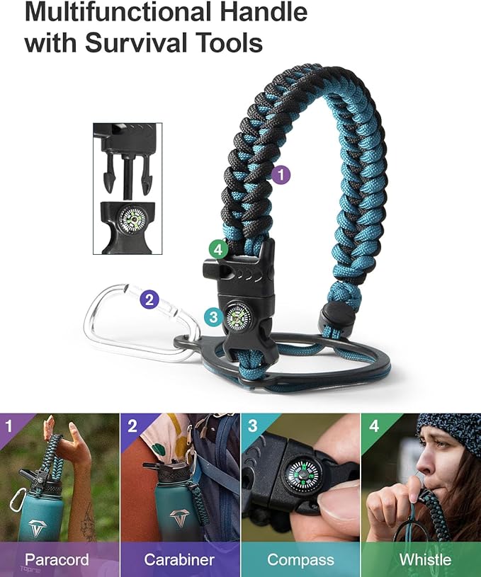 - Ready for adventures: Topre 32oz water bottles include a paracord handle,it is crafted from sturdy braided rope with an attached survival kit. This includes a compass, a whistle, and a clip, making it an ideal companion for any outdoor activity — be it camping,hiking or exploring new places through travelling.