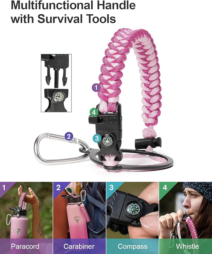 - Ready for adventures: Topre 40oz water bottles includes paracord handle is crafted from sturdy braided rope with an attached survival kit. This includes a compass, a whistle, and a clip, making it an ideal companion for any outdoor activity — be it camping,hiking or exploring new places through travelling.