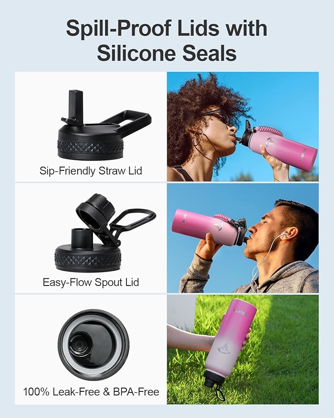 - 100% Leak-Proof: Topre 40 oz stainless steel water bottles includes two lids—a straw lid and a spout lid. Both are equipped with silicone rings to prevent any spills or leaks, and are completely BPA-free for your peace of mind.