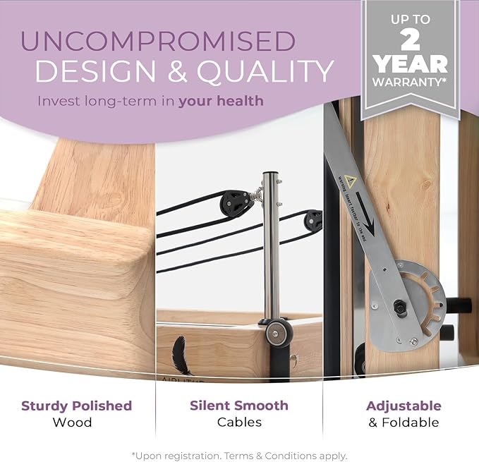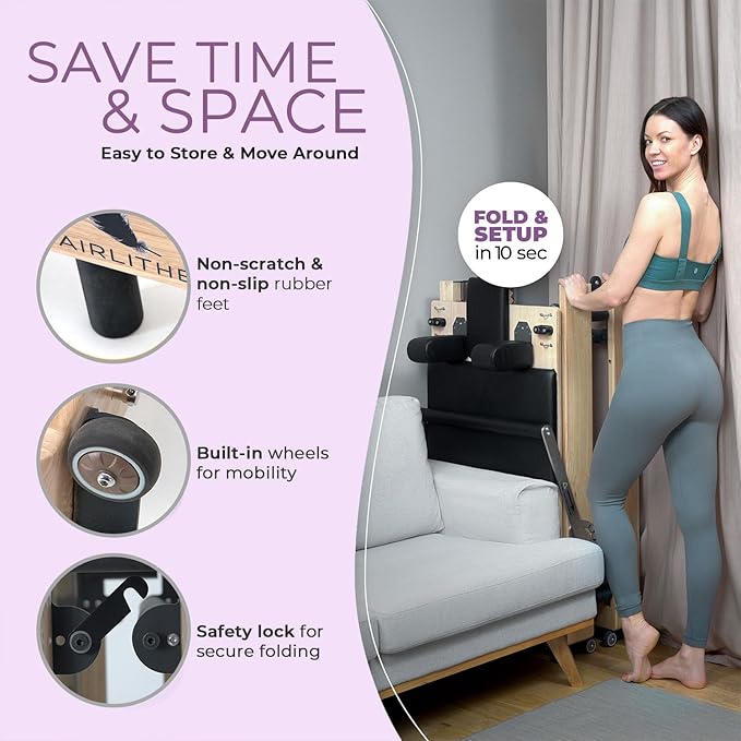 Airlithe Foldable Pilates Reformer Machine|Wooden Frame Reformer Machine with Strings, Versatile Accessories & 50+ Expert-Guided Workouts|Equipment for Strength Training, Rehabilitation, & Flexibility