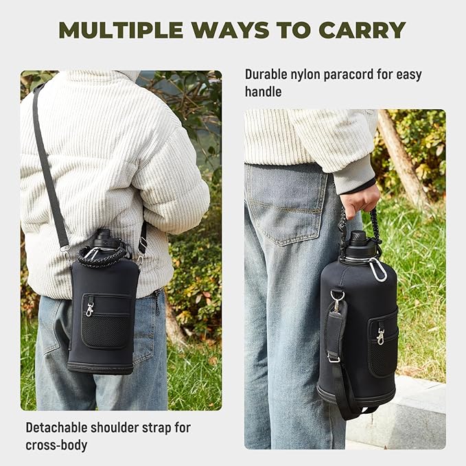 - What You'll Get: Buy 2 pack one gallon insulated water bottle, independent carton packaging๏ผget double accessories (Carrying Pouch, Straw Lid with 2 Straws & Straw Brush, Spout Lid, Paracord Handle, Bottle Brush). We offer Continuous After-sales Service and 100% customer satisfaction against any leakage or insulation failure