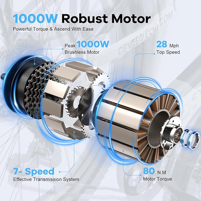 - Powerful 1000W Peak Electric Bike:high speed brushless Peak 1000W motor and 7-speed transmission, making steep hills and long rides a breeze, up to 25+MPH, up to 80+ Miles, Long-range e-bike offers perfect efficiency and balance of power to ensure your ride as enjoyable. More Powerful, More Fun, No Fear Uphill, Stable Less noise,Low maintenance than 350w electric bike. e-bike is perfect for para adultos