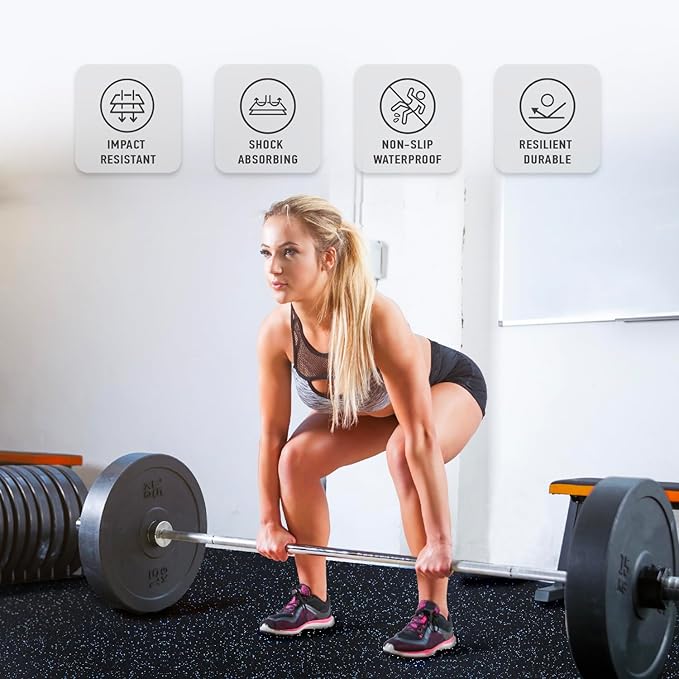 - [Upgraded Dual-Layer Design]: Concerned about your equipment scratching the floor during workouts? Our 2in1 Rubber Top EVA Foam Exercise Gym Mats are crafted to solve this issue. The textured rubber top layer, combined with a high-density EVA foam bottom layer, seamlessly creates a non-slip tough surface with excellent shock absorption.