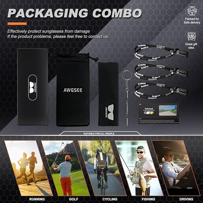 - USE OCCASIONS ► AWGSEE polarized sunglasses help reduce glare and provide extra clarity while keeping your eyes protected. Is ideal for usage by motorcycle and cycling, driving, running, fishing, climbing, golf, trekking or other outdoor activity enthusiasts.