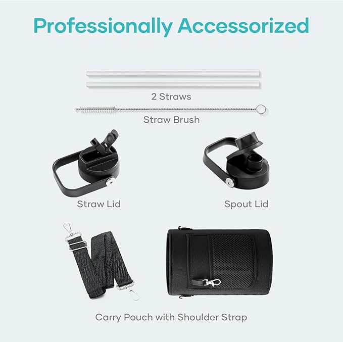 - What You Get: Buzio 128oz Water Bottle with carrying pouch, Straw Lid, Flex Lid, 2 x Straws, Bottle Brush
