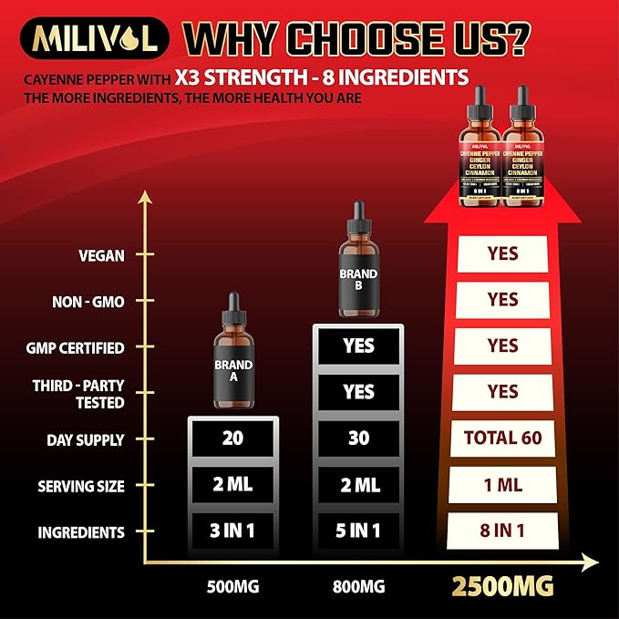 - ✔️ Easy to Use: 2 Packs of 30ml. Each Cayenne Pepper Extract Drops contains 30ml of liquid, providing a 30-day supply. Only 1ml per day, it’s simple to incorporate into your daily routine.