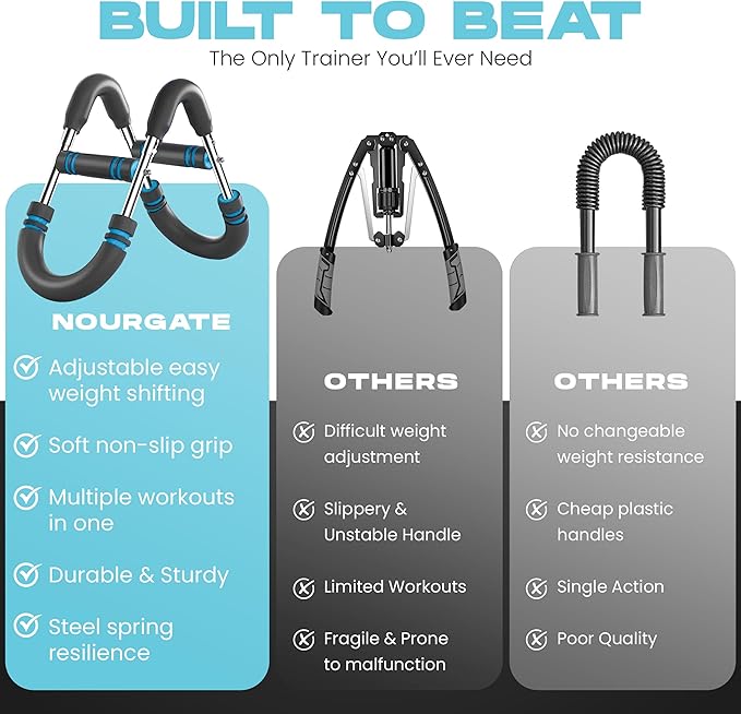 - 【TWISTER ARM TRAINER】NOURGATE adjustable twister arm trainer for men and women helps you to strengthen your home fitness training and sculpt chest muscles, push through plateaus and enhance arm definition. Designed to effectively work a variety of muscles groups at once. Say goodbye to bulky gym equipment and save space. A perfect companion for your fitness routine.