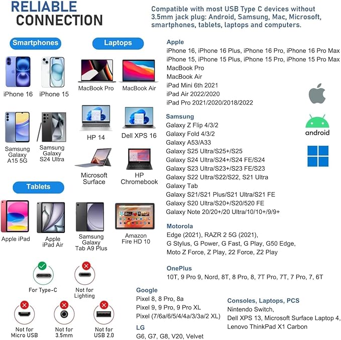 - SAMSUNG: Galaxy S24/S23/S22/S21/S21+/S21 Ultra/S21/S21 Ultra/S21 FE/S20/ Galaxy Tab S8/S7/S6/S5e, A53/A54/A33/A34 - GOOGLE Pixel 7/6a/6 PRO/6/5/4/4a โ MOTOROLA Edge 2021 โ LAPTOPS: DELL XPS 13, MICROSOFT Surface Laptop 4. And more devices without a 3.5mm jack port. We provide a 5-year warranty and our customer support is here to answer questions 24/7