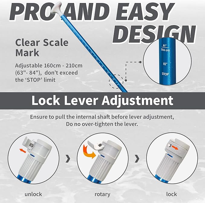 - Adjustable SUP Paddle (63"-84") - Perfect for most riders and works great with inflatable paddle boards. The telescoping design adjusts from 63 to 84 inches (160-210 cm). For best control, set it 4-6 inches taller than you