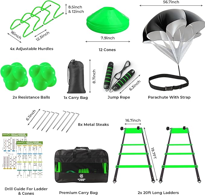 • "Agility Training Equipment Kit": Includes a 2 * 20ft agility ladders with 8 ground stakes, 4 adjustable agility hurdles, 12 vibrant yellow disc cones, and a high-resistance running parachute. Perfect for all skill levels—from beginners to pros—this set is built to elevate your speed, coordination, and overall athletic performance.