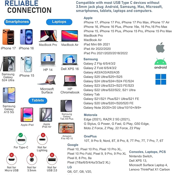- SAMSUNG: Galaxy S24/S23/S22/S21/S21+/S21 Ultra/S21/S21 Ultra/S21 FE/S20/ Galaxy Tab S8/S7/S6/S5e, A53/A54/A55/A33/A34/A35 Galaxy Z Flip 6/5/4/3/2 Fold 6/5/4/3/2 - GOOGLE Pixel 10/Pro/XL/Fold, Pixel 9/Pro/XL, 8/Pro/8a, 7/6a/6 PRO/6/5/4/4a โ MOTOROLA Edge 2021 โ LAPTOPS: DELL XPS 13, MICROSOFT Surface Laptop 4. And more devices without a 3.5mm jack port. We provide a 5-year warranty and our customer support is here to answer questions 24/7