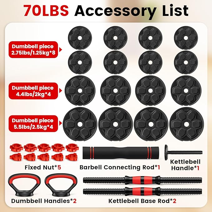 - 【Free Choice of Weight】The weight set's detachable design increases the flexibility of use. the single dumbbell is adjustable from 5-22 lbs, barbells: 8-47 lbs, and kettlebells: 5-23lbs. Effectively meeting your different exercise needs during various stages.Installation is simple.