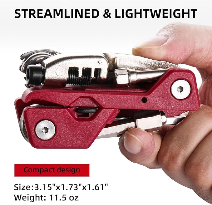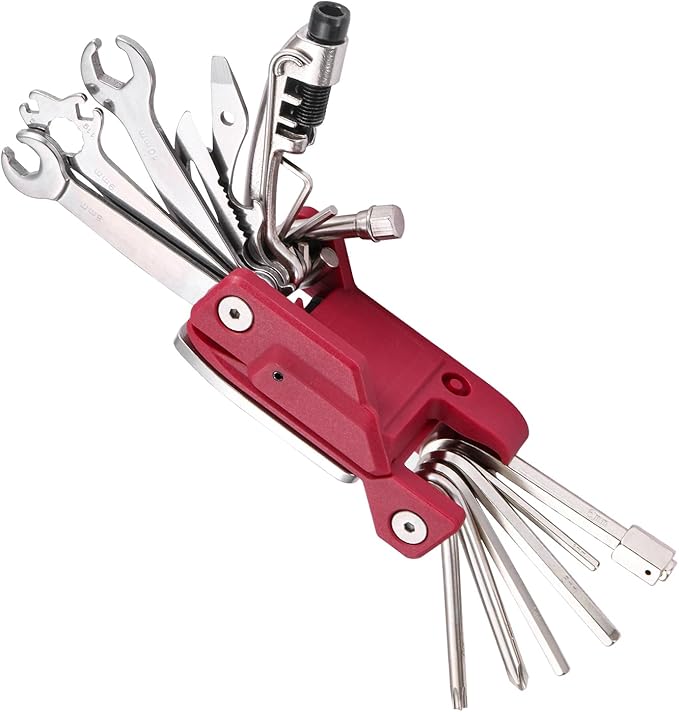 - 21 in 1 Multi-Function Tool Kits: hex key (2/2.5/3/4/5/6/8/10mm)*1,phillips screwdriver PH2*1,torx key T25 *1,wrench 0.59 in(15mm),mini pedal wrench 0.31/0.35/0.39 in(8/9/10mm)*1,wrench 0.31/0.39 in(8/10mm)*1,bottle opener*1,chain hook *1,chain riveter*1,knife *1,tire iron & air valve punch *1,spoke spanner 14g/15g & ring wrench 0.35 in(9mm)*1,screwdriver(flat head) & chain pin tool*1,storage compartment for chain pins*1,tire iron *1,locking button *1,locking bracket *1.