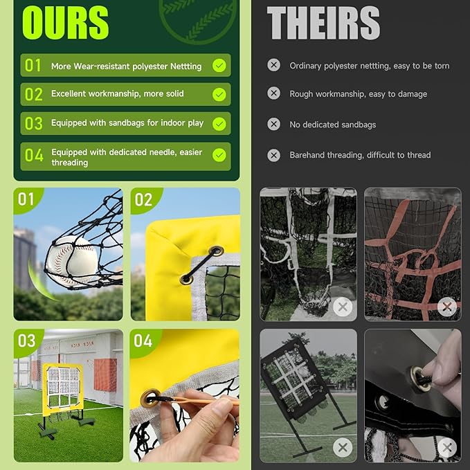 - Effortless Assembly & Storage: Designed with simplicity in mind, our baseball pitching net can be assembled or disassembled in mere minutes.It is also equipped with 2 customized threading needles, 4 U-shaped ground nails and 2 sandbags (empty), which makes the entire installation and use easier. Additionally, a spacious carrying bag is included, making storage a breeze. You can easily store it in the garage, basement or take it with you to different locations for training