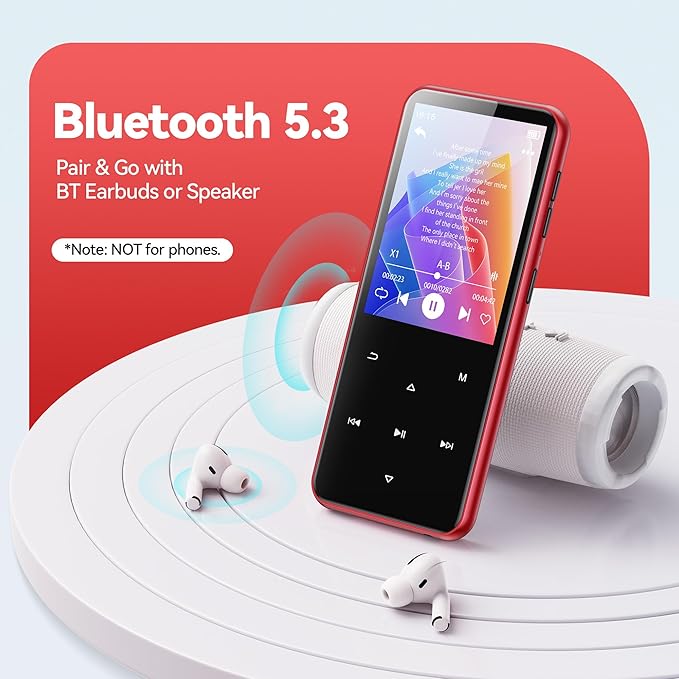 AGPTEK 64GB MP3 Player with Bluetooth, M3 2.4 inch Music Player with Speaker and FM Radio, Touch Buttons, Supports Up to 128GB (Black Red)