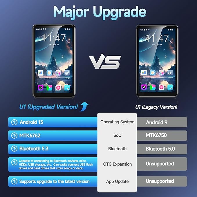 - 🤖【Android 13 OS + App Support】Smart MP3 Player with Streaming ⚡ Runs on the latest Android 13, allowing access to Spotify, TikTok, YouTube, and more for online streaming or offline downloads. A hybrid MP3 player that combines smartphone-like flexibility with dedicated high-res audio playback.