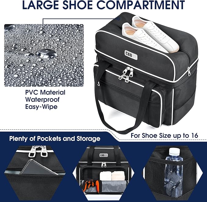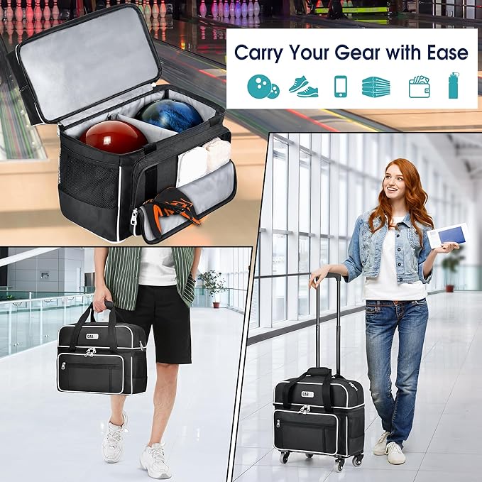 - β MULTIFUNCTION POCKETS : Multifunction pockets are in the front of 4-wheels 2 ball bowling bag for your phones, keys, towels.Two Side Pockets: Twins large mesh pockets are the sides of the bowling bag not only for storing your bottles. In addition, there is a separate waterproof shoe compartment at the top of the bag, which can store a pair of bowling shoes up to men size 16.