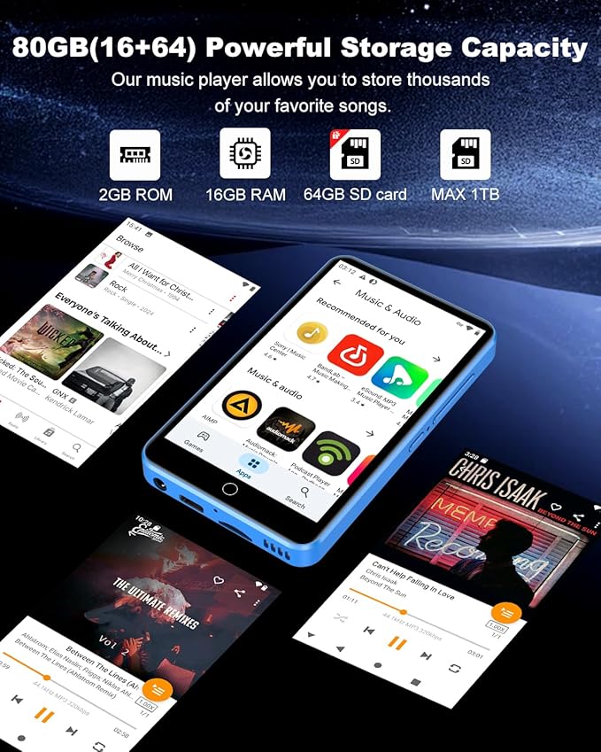 - 📶Bluetooth & WiFi: Fast, Stable Connection. Equipped with newly upgraded Bluetooth and WiFi wireless technology, this smart MP3 player connects to your Bluetooth headphones, car stereos, speakers, or mobile phones faster, more stably, and with no delay. It delivers a smooth, reliable data transmission experience, letting you enjoy your favorite music at home, outdoors, or during trips—we understand your needs better.